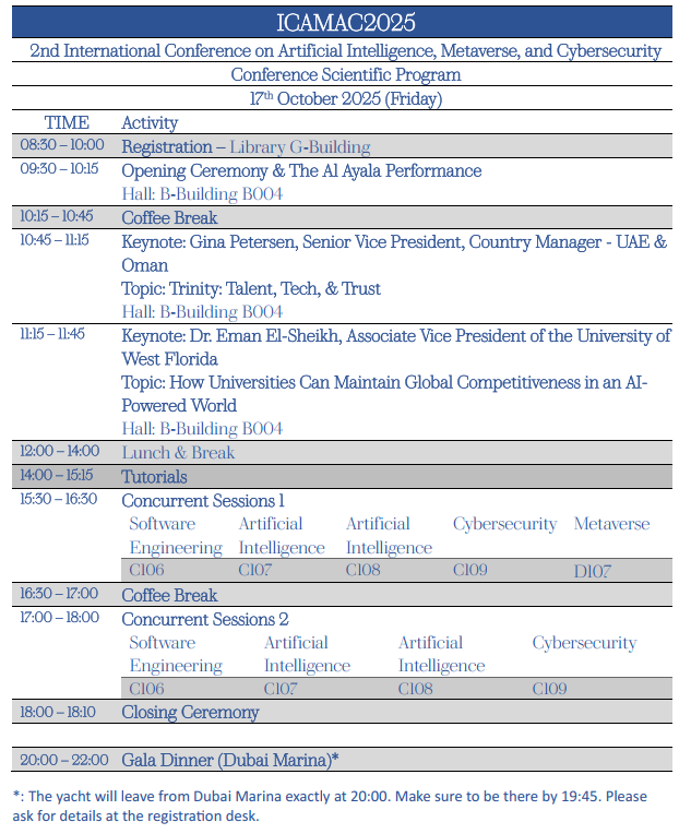 The 2nd International Conference on Artificial Intelligence, Metaverse, and Cybersecurity (ICAMAC) took place on October 17-18, 2025, in the dynamic city of Dubai, UAE. Organized by the Rochester Institute of Technology Dubai and co-organized by Sakarya University (Turkey) and the Sharjah Higher Colleges of Technology (UAE), this groundbreaking event focused on the theme of Cybersecurity.